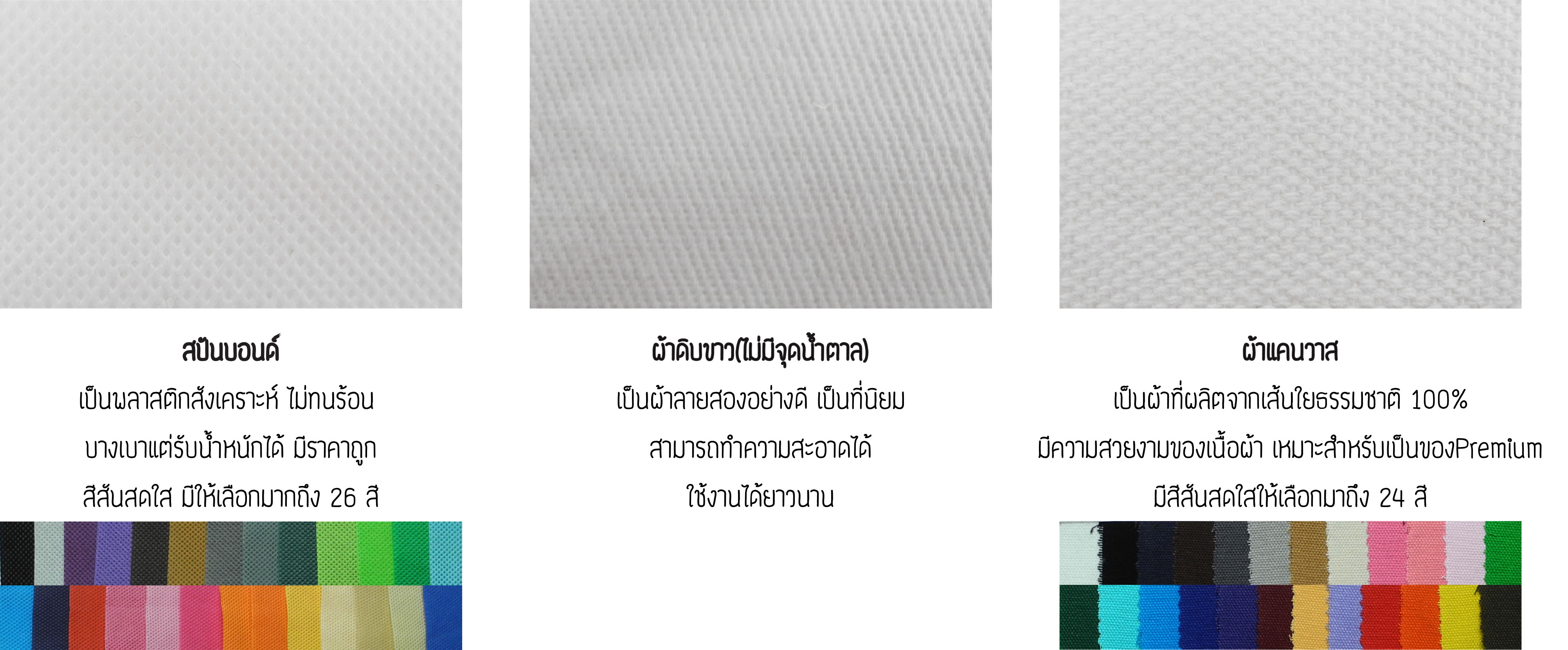 หรือผ้าสปันบอนด์เป็นพลาสติกสังเคราะห์ บางเบาแต่รับน้ำหนักได้ มีราคาถูก และสีสันสดใส มีสีให้เลือกมากกว่า 26 สีโรงงานผลิตกระเป๋าผ้าลดโลกร้อน